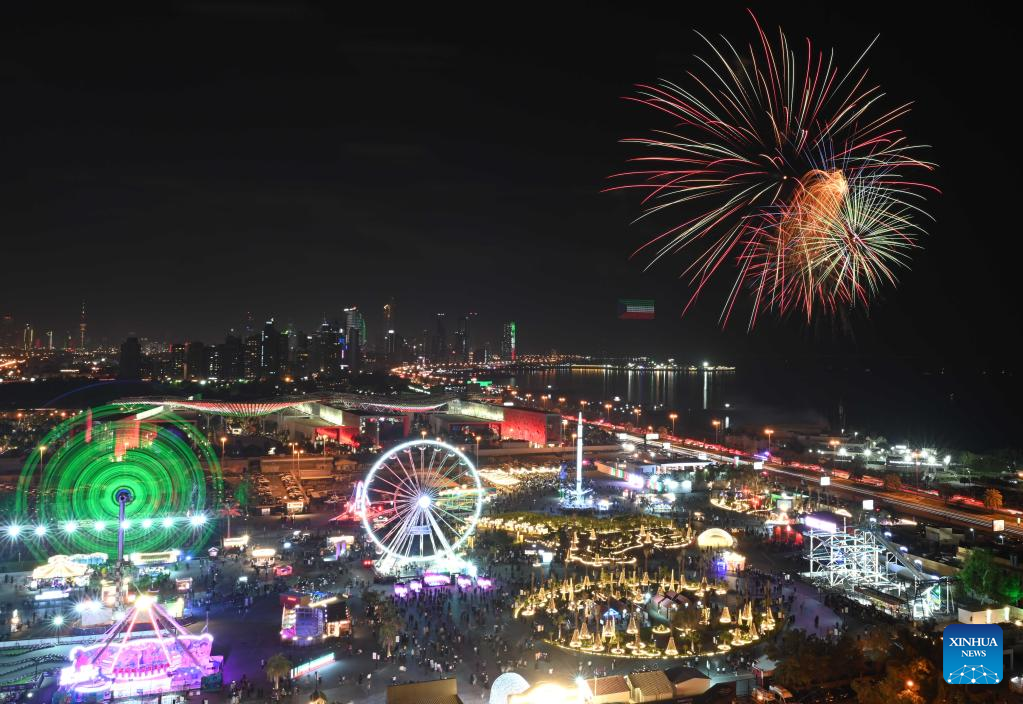 Fireworks in celebration of Kuwait's National and Liberation Days are pictured in Hawalli Governorate, Kuwait, Feb. 25, 2023. Celebrations were held to mark Kuwait's National and Liberation Days, which are observed annually on Feb. 25 and 26. (Photo by Asad/Xinhua)