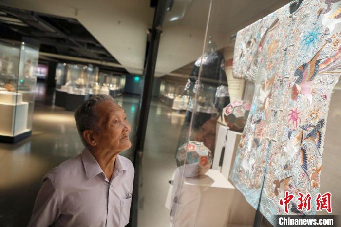 Xu Chiguang looks at a piece of Guangdong embroidery. (Photo/Shao Bing)