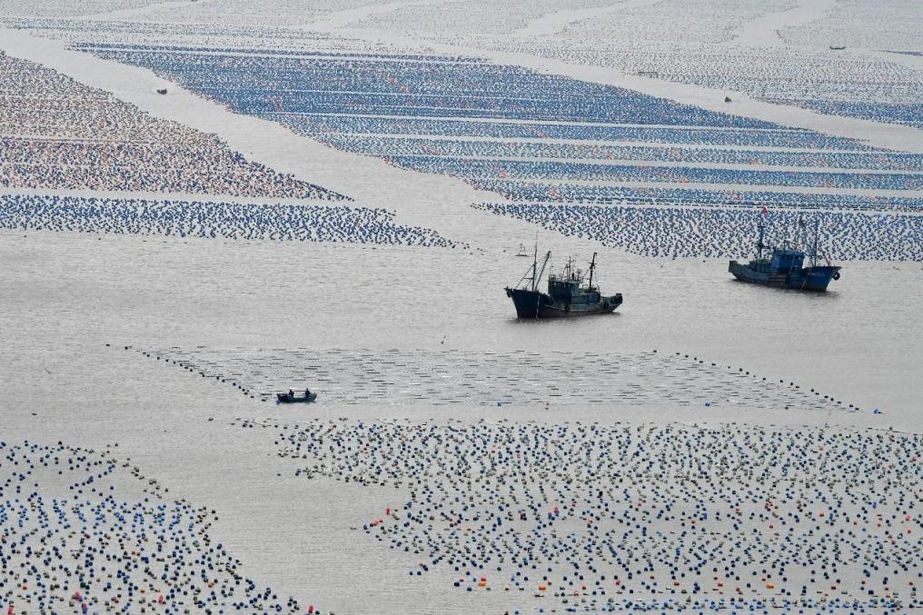Fishermen drive boats for breeding operations on a sea farm in Lianjiang county, Fuzhou, southeast China's Fujian province. (People's Daily Online/Wang Wangwang)