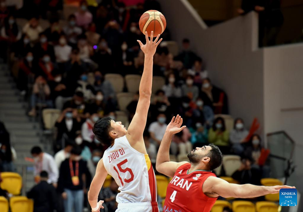 Cui Yongxi (1st L) of China breaks through during the Group F match between China and Iran of FIBA Basketball World Cup Asian Qualifiers in Hong Kong, south China, Feb. 26, 2023. (Xinhua/Lo Ping Fai)