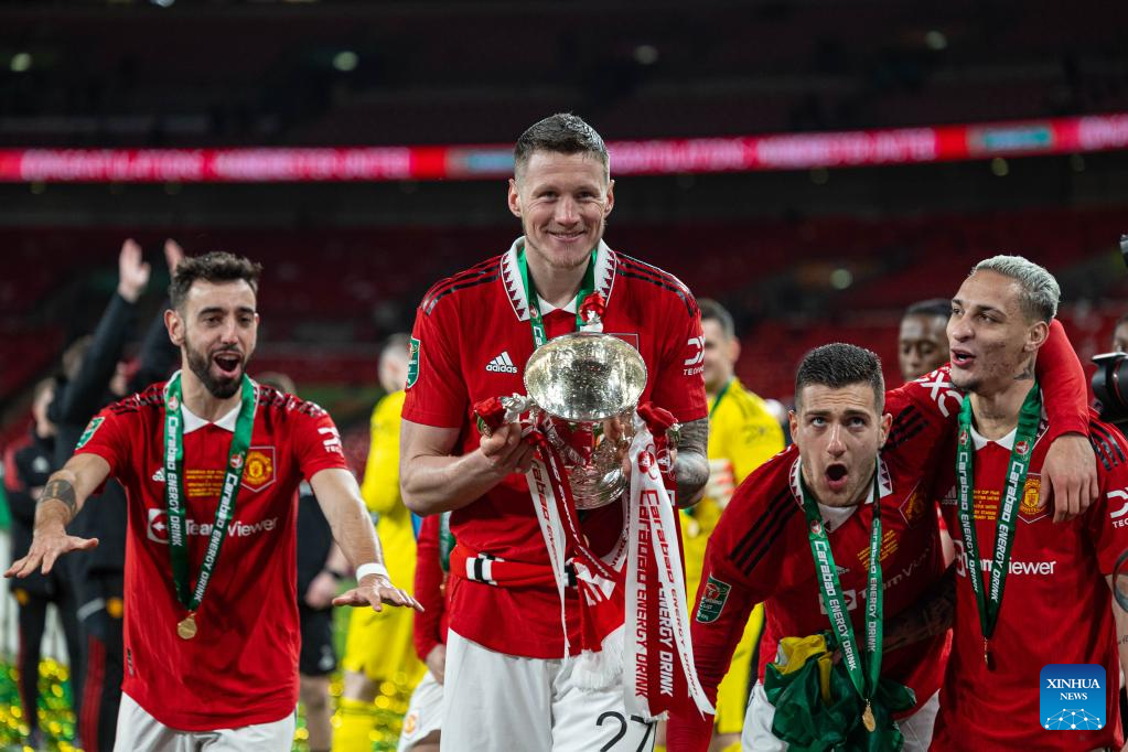 Manchester United's Wout Weghorst (2nd L) celebrates with the trophy after the Football League Cup Final match between Manchester United and Newcastle United in London, Britain, on Feb. 26, 2023. (Xinhua)
