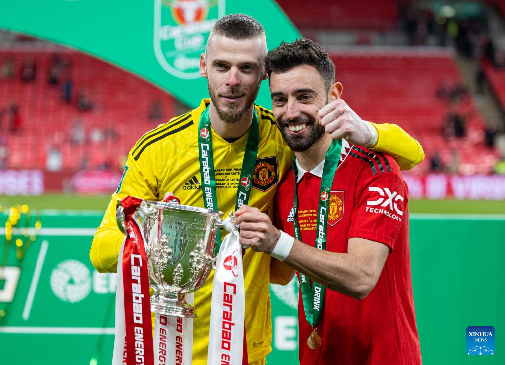Manchester United's goalkeeper David de Gea (L) and player Bruno Fernandes celebrate with the trophy after the awarding ceremony for the Football League Cup Final match between Manchester United and Newcastle United in London, Britain, on Feb. 26, 2023. (Xinhua)