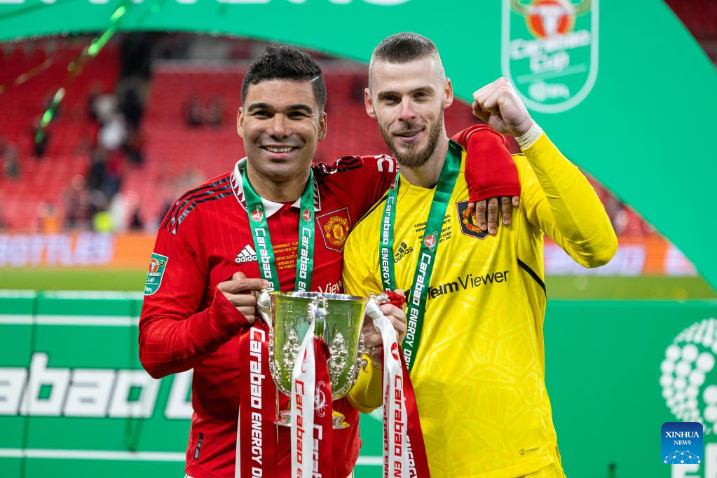 Manchester United's goalkeeper David de Gea (R) and player Casemiro celebrate with the trophy after the awarding ceremony for the Football League Cup Final match between Manchester United and Newcastle United in London, Britain, on Feb. 26, 2023. (Xinhua)