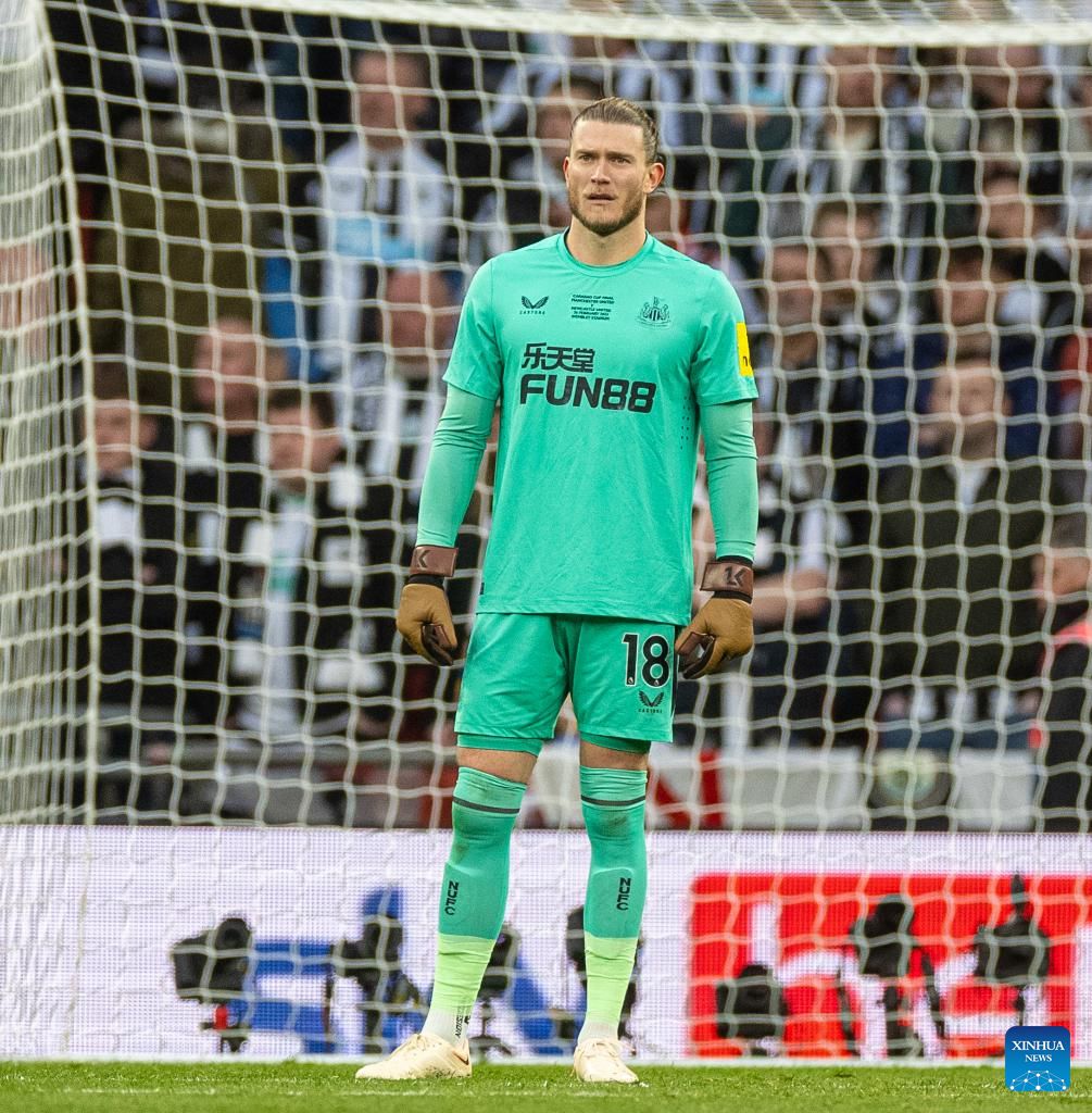 Newcastle United's goalkeeper Loris Karius reacts during the Football League Cup Final match between Manchester United and Newcastle United in London, Britain, on Feb. 26, 2023. (Xinhua)