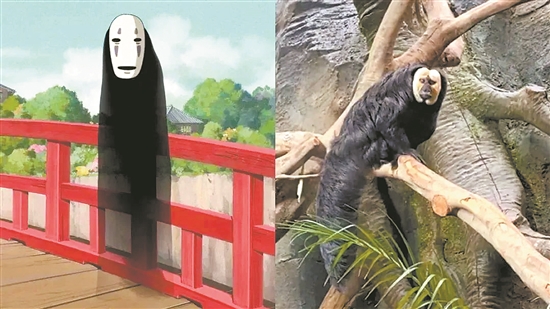 Combo photos shows No-face (left), a character in the Japanese animated film Spirited Away directed by Hayao Miyazaki, and Du Du (right), a male white-faced saki in the Hongshan Forest Zoo in Nanjing, capital of east China's Jiangsu Province. (Photo/CCTV newscenter)