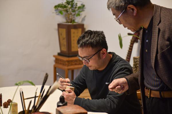 Su Donghe (right) teaches his inheritor seal carving. (Photo/CCTV News)