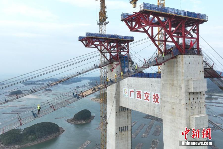 Aerial view shows the Longmen Bridge is under construction in Qinzhou, south China's Guangxi Zhuang Autonomous Region, Feb. 24, 2023. (Photo: China News Service/Wang Ronghua)
