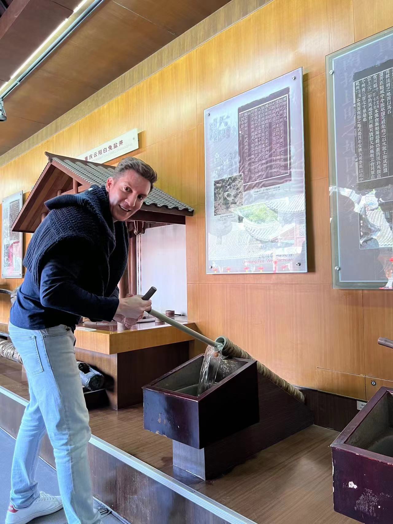 A visitor experiences a pumping model at the Zigong Salt Industry History Museum. (People’s Daily Online/Zhong Wenxing)