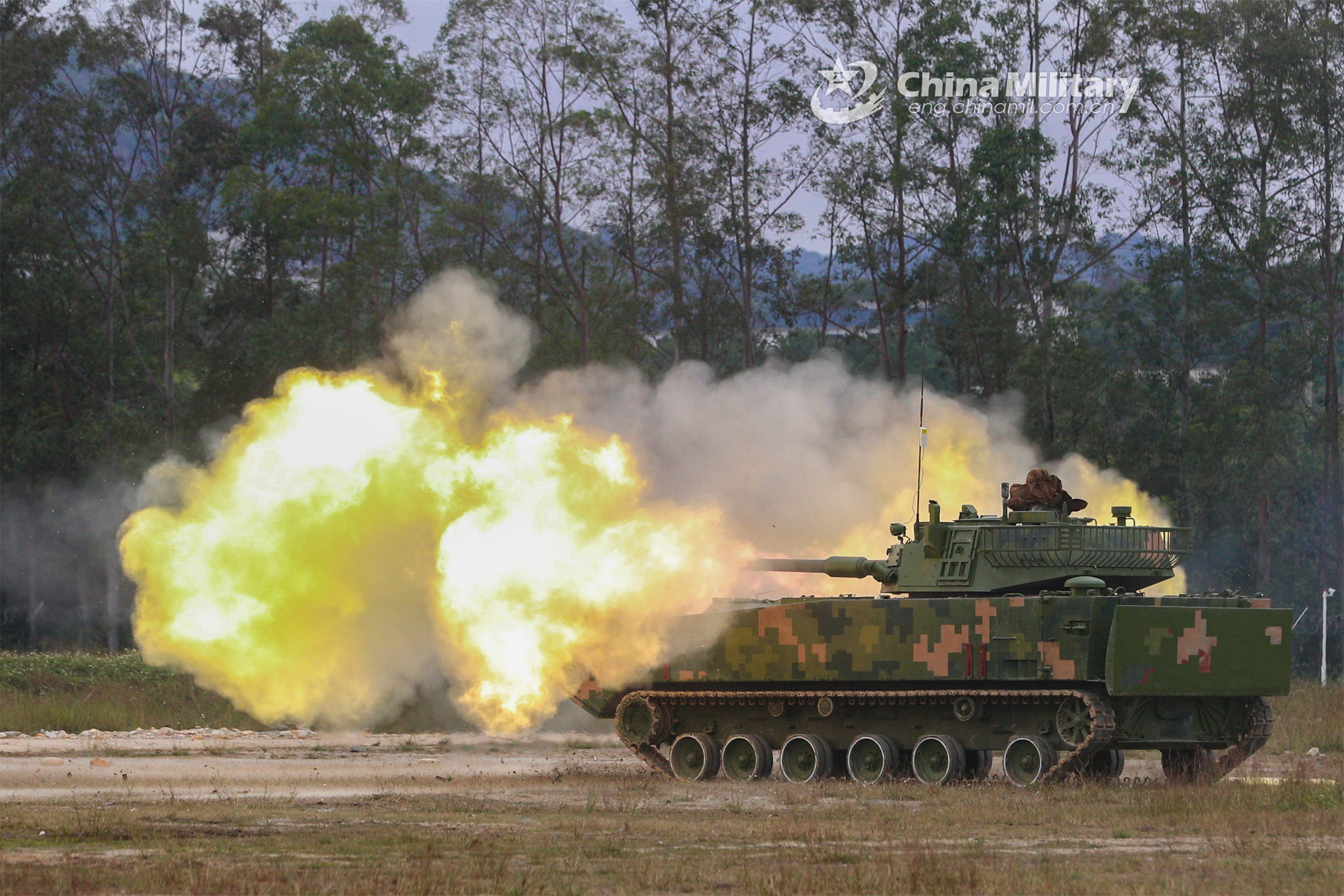 An amphibious armored assault vehicle attached to the PLA 74th Group Army spits fire at simulated target during a recent live-fire training exercise. (eng.chinamil.com.cn/Photo by Li Bin)