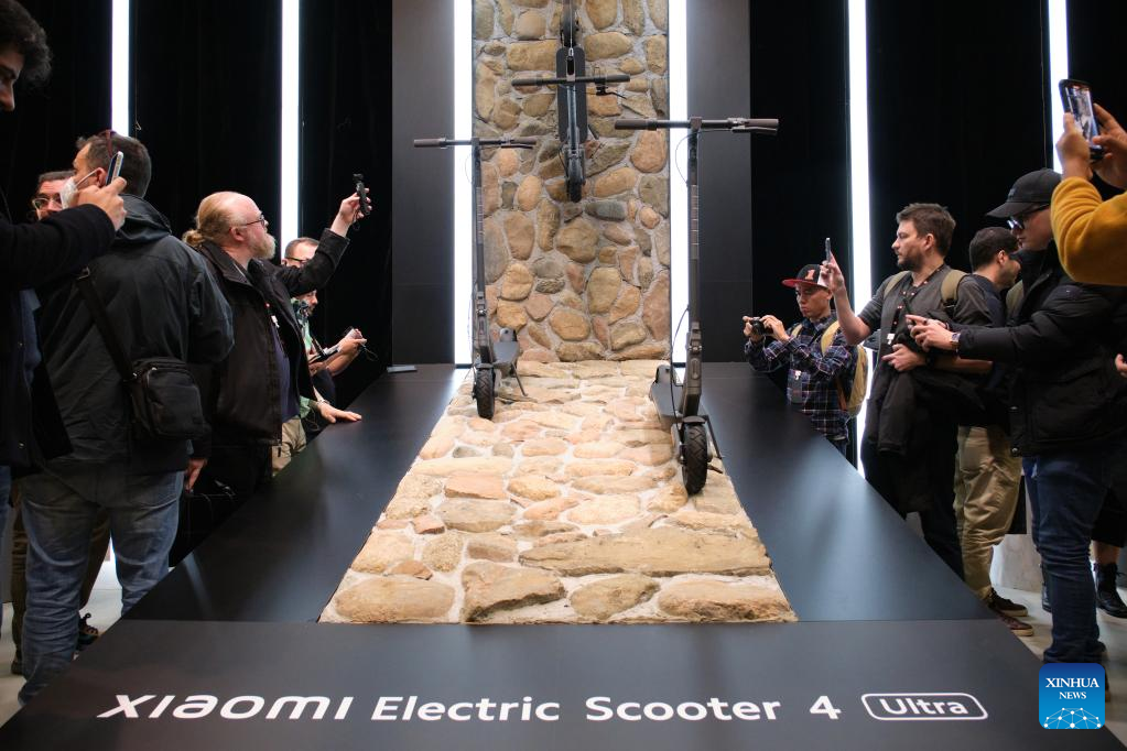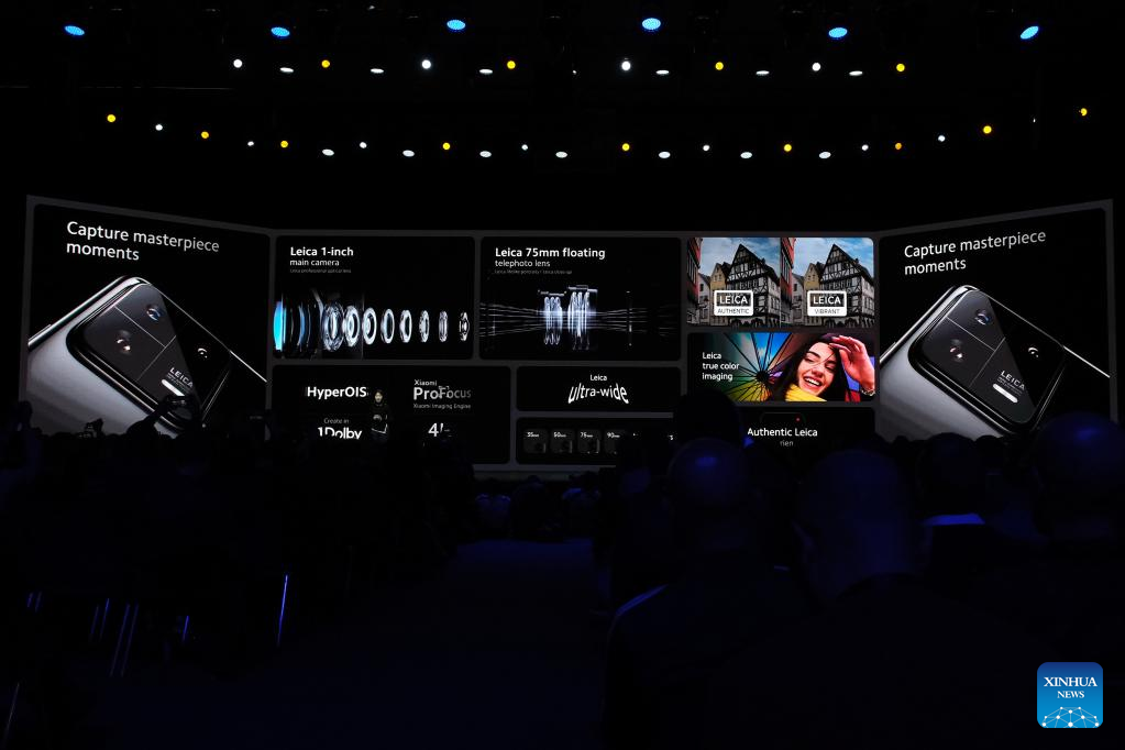 This photo taken on Feb. 26, 2023 shows the new products launch event of Chinese tech firm Xiaomi in Barcelona, Spain. Several products, including new smartphones, were released during the launch event of Xiaomi in Barcelona international convention center on Sunday. (Xinhua/Meng Dingbo)
