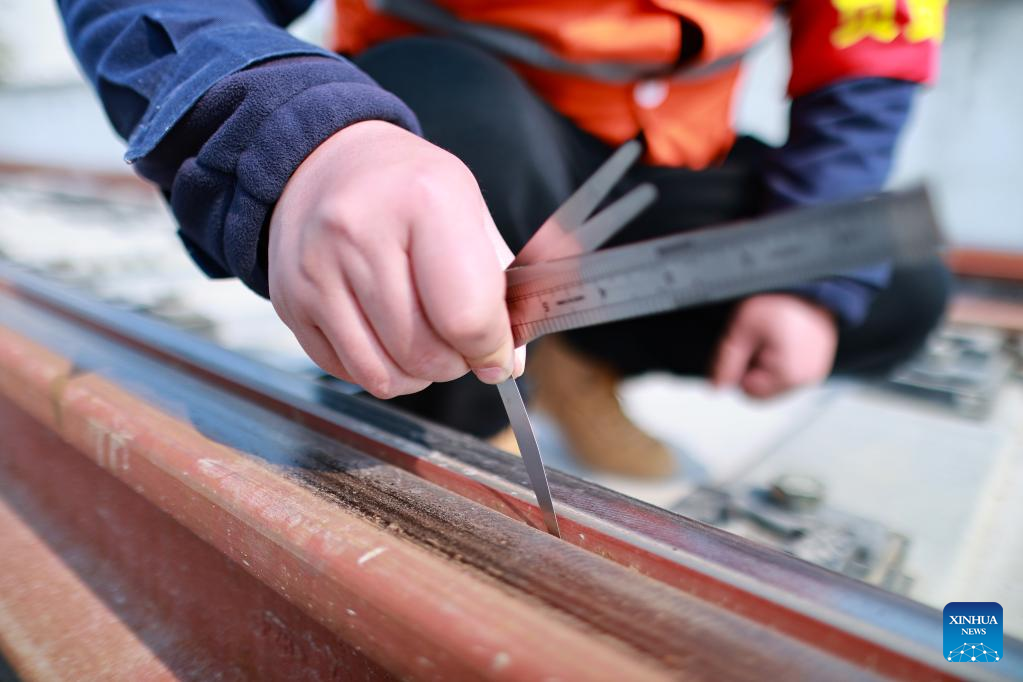 A technician uses a filler gauge to monitor the rail track switch gap near the Duyun East Railway Station along Guiyang-Nanning high-speed railway in Duyun, southwest China's Guizhou Province, Feb. 27, 2023. The Guiyang-Nanning high-speed railway, with a maximum speed of 350 km per hour, is expected to go into service in 2023. (Xinhua/Liu Xu)