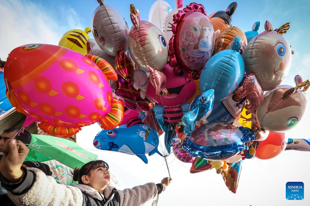 A vendor sells balloons at a weekly bazaar in Tokkuzak Township of Shufu County, northwest China's Xinjiang Uygur Autonomous Region, Feb. 26, 2023. (Xinhua/Ma Kai)