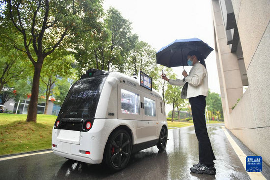 A customer buys products from an unmanned vehicle in central China's Hunan Province. (Xinhua/Chen Zeguo)