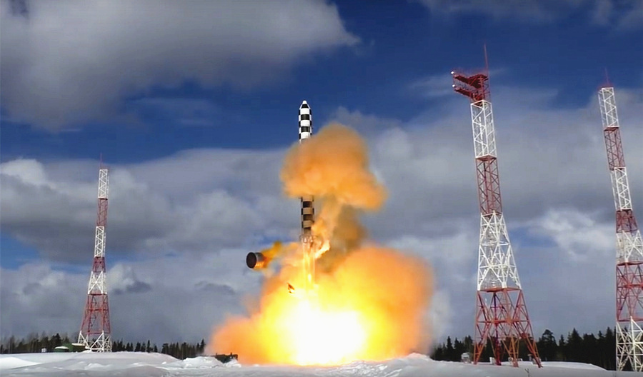 In this image from video provided by the Russian Defense Ministry, the Sarmat intercontinental ballistic missile blasts off during a test launch from the Plesetsk launch pad in northwestern Russia, March 30, 2018.