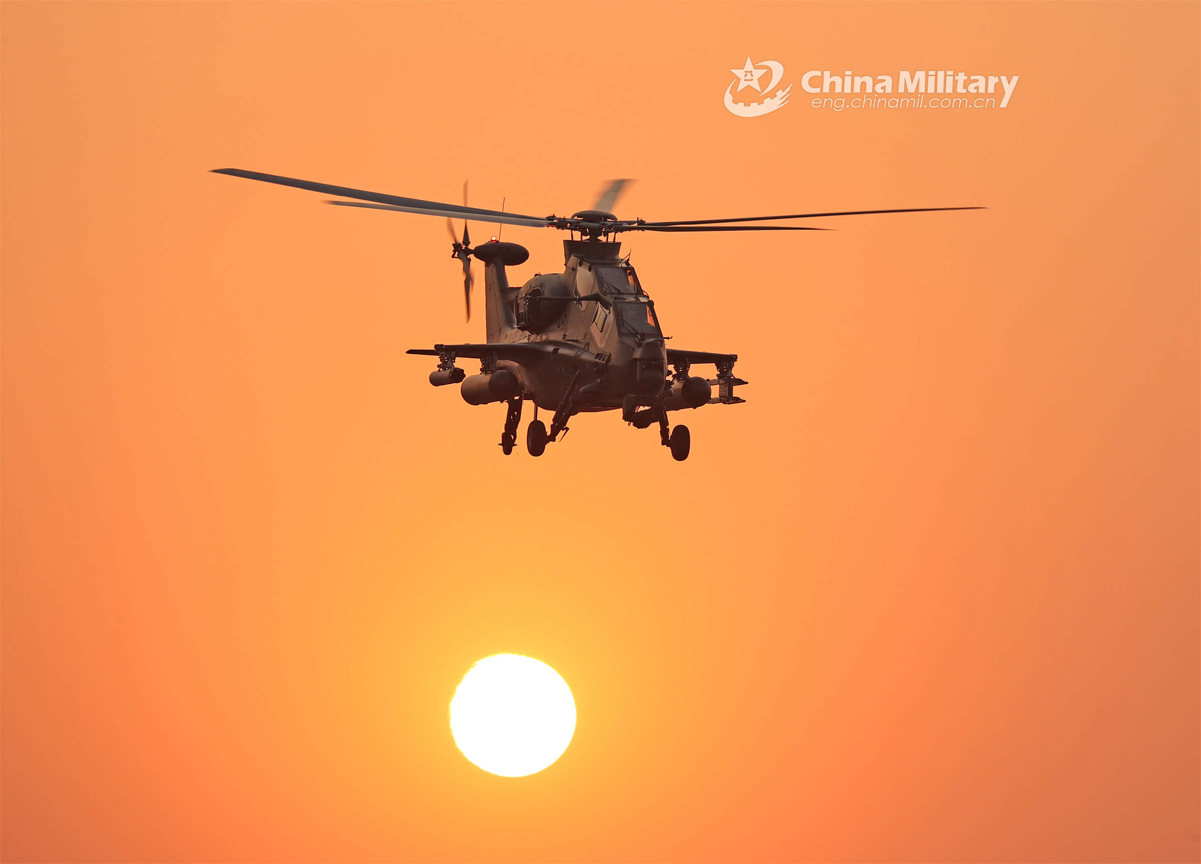 An attack helicopter attached to an army aviation brigadeunder the PLA 72nd Group Army flies at sunset during a round-the-clock flight training exercise in late February, 2023. (eng.chinamil.com.cn/Photo by Zhang Huanpeng)