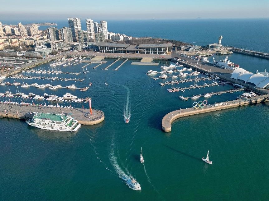 Photo taken on Feb. 26, 2023 shows yachts and sail boats at the Qingdao Olympic Sailing Center, east China's Shandong province. (People's Daily Online/Tang Ke)