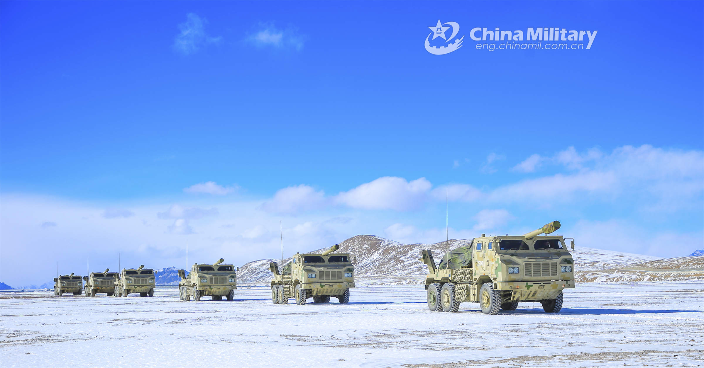 Truck-mounted artillery systems attached to a firepower element with a regiment under the PLA Xinjiang Military Command maneuver in speed en route to an assembly area during a tactical maneuver training exercise in mid-February, 2023. (eng.chinamil.com.cn/Photo by Chen Ming)