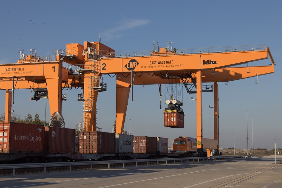 A crane remotely controlled with the help of 5G technology, moves a container at the East-West Gate (EWG) Intermodal Logistics Terminal near the village of Fenyeslitke, eastern Hungary, on Oct. 18, 2022. (Photo by Attila Volgyi/Xinhua)