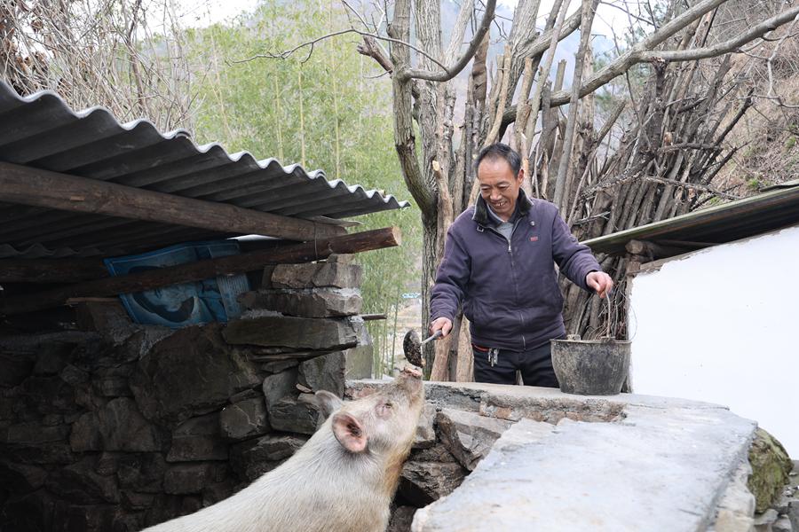 Yang Changcun feeds a pig. (Photo/Yuan Taoxiong)