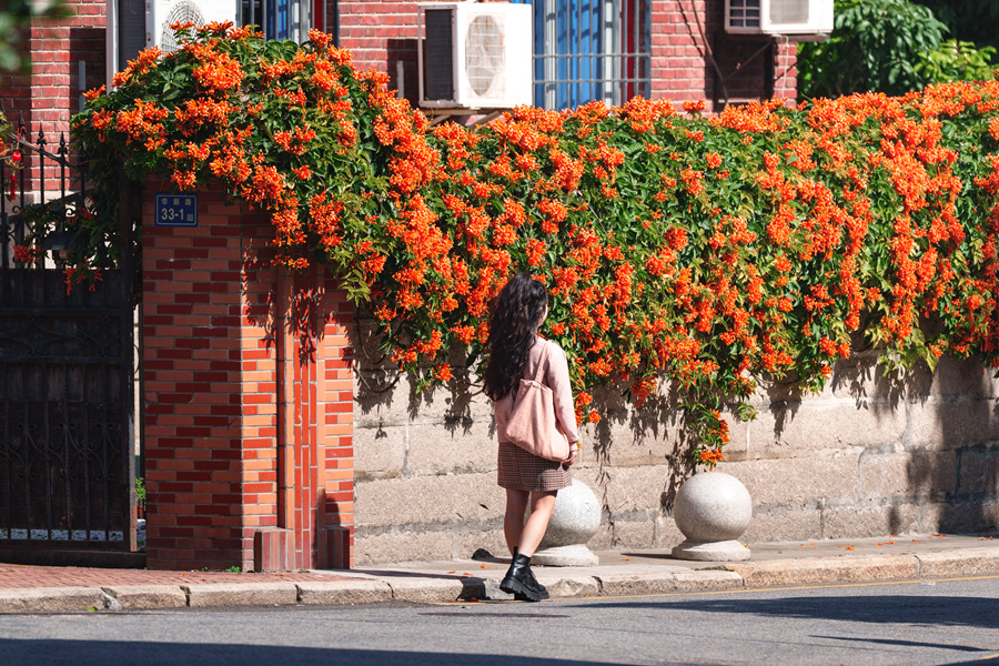 Photo shows blooming orange trumpet vines beside an antique villa in Xiamen, southeast China’s Fujian Province. (Photo/Yang Hongxiang)
