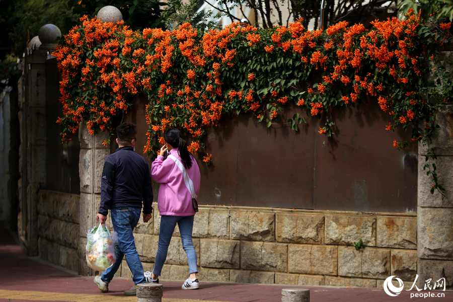 Photo shows blooming orange trumpet vines in Xiamen, southeast China’s Fujian Province. (People’s Daily Online/Chen Bo)