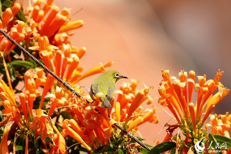 A warbling white-eye frolics amid a cluster of orange trumpet vines in Xiamen, southeast China’s Fujian Province. (People’s Daily Online/Chen Bo)