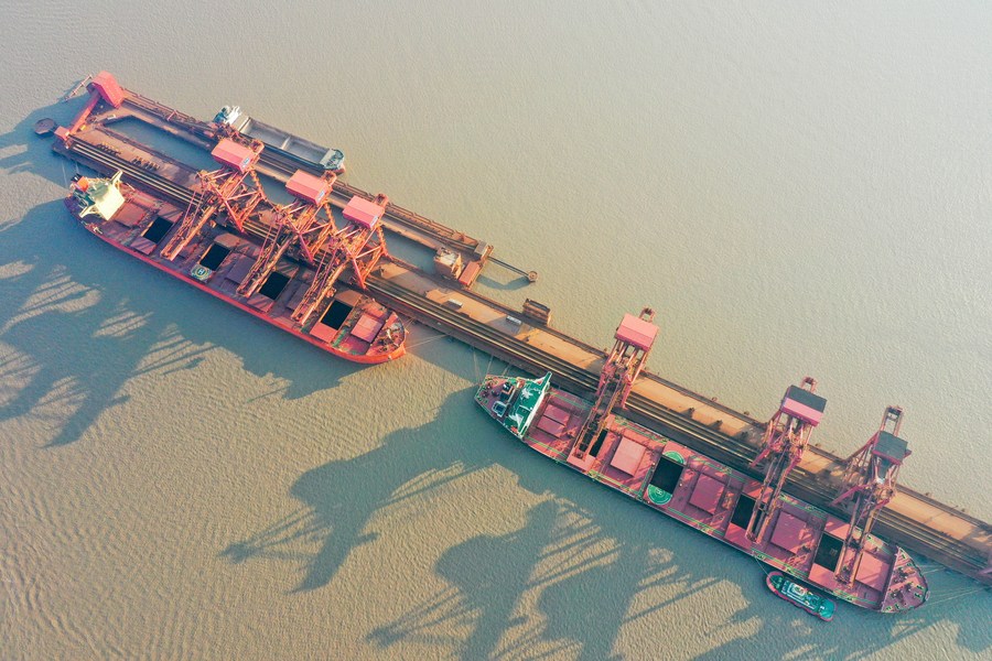 This aerial photo taken on Jan. 30, 2023 shows a view of the Ningbo-Zhoushan port in east China's Zhejiang Province. (Photo by Jiang Xiaodong/Xinhua)
