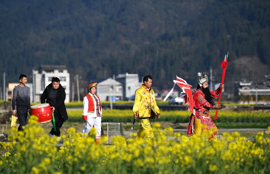 A troupe of Dong Opera goes for a performance in Tianzhu County, southwest China's Guizhou Province, Feb. 26, 2023. (Xinhua/Yang Wenbin)