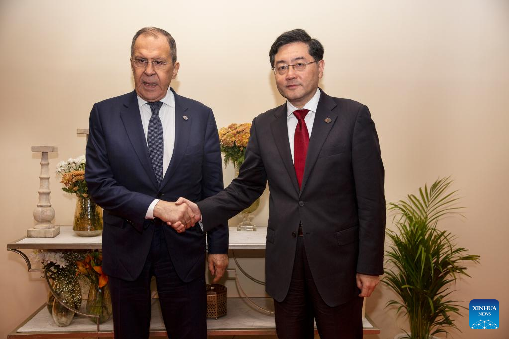 NEW DELHI, March 2 (Xinhua) -- Chinese Foreign Minister Qin Gang met with his Russian counterpart Sergei Lavrov on Thursday over bilateral ties and a political settlement of the Ukraine crisis on the sidelines of the Group of 20 (G20) Foreign Ministers' Meeting held here in New Delhi.