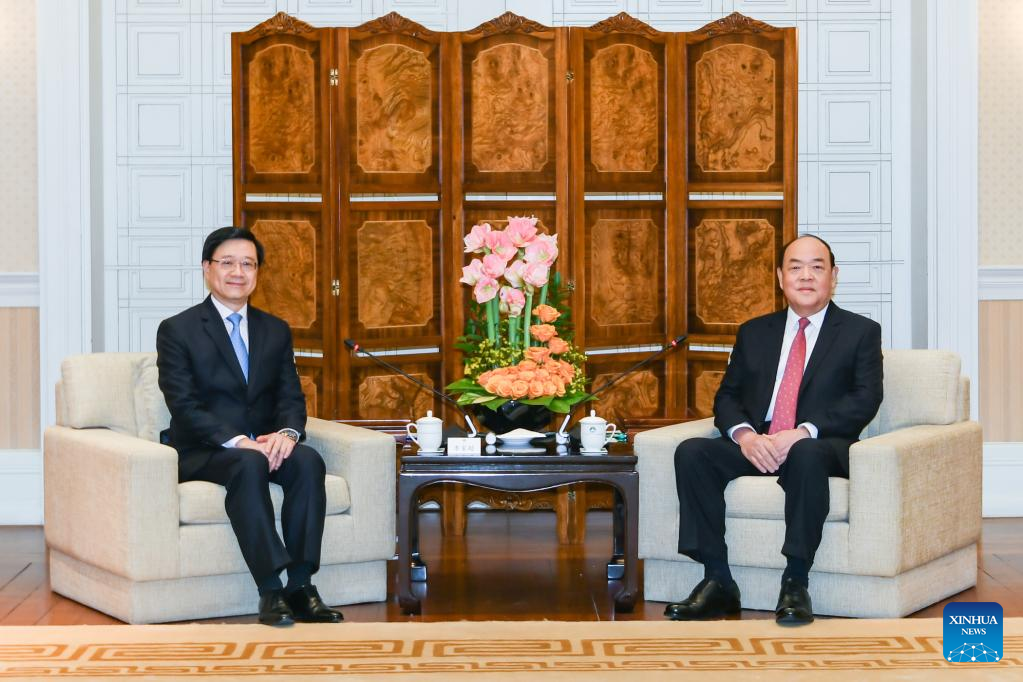 MACAO, March 2 (Xinhua) -- Chief Executive of the Macao Special Administrative Region (SAR) Ho Iat Seng and Chief Executive of the HKSAR John Lee met Thursday in Macao, pledging to jointly promote coordinated development of the two SARs and integrate into overall national development.