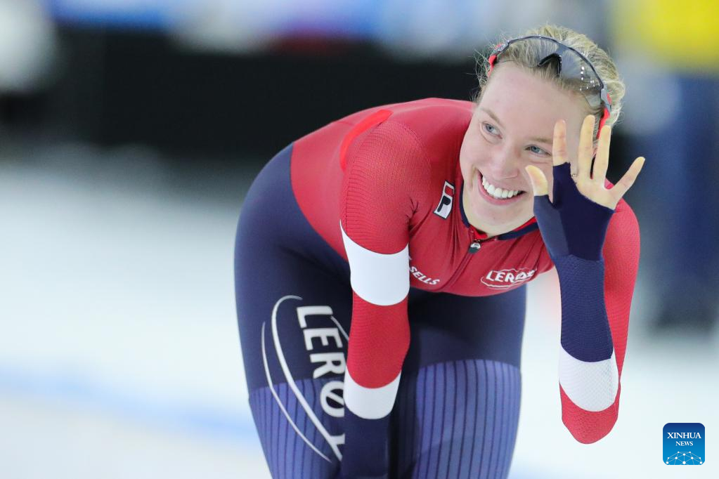 Ragne Wiklund of Norway reacts after women's 3000m on the Day 1 of the ISU World Speed Skating Championships in Heerenveen, the Netherlands, March 2, 2023. (Xinhua/Zheng Huansong)