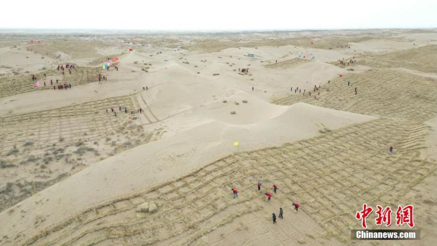 Locals make straw checkerboard sand barriers to combat desertification in Wuwei, northwest China's Gansu Province, March 2, 2023. Gansu has taken effective measures in fighting against desertification. (Photo/China News Service)