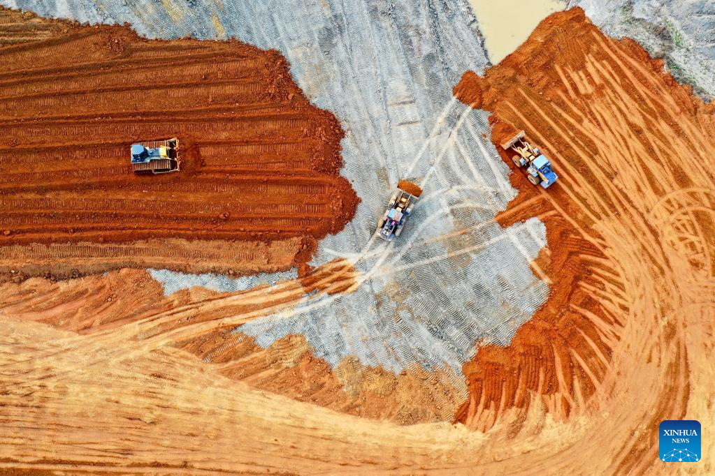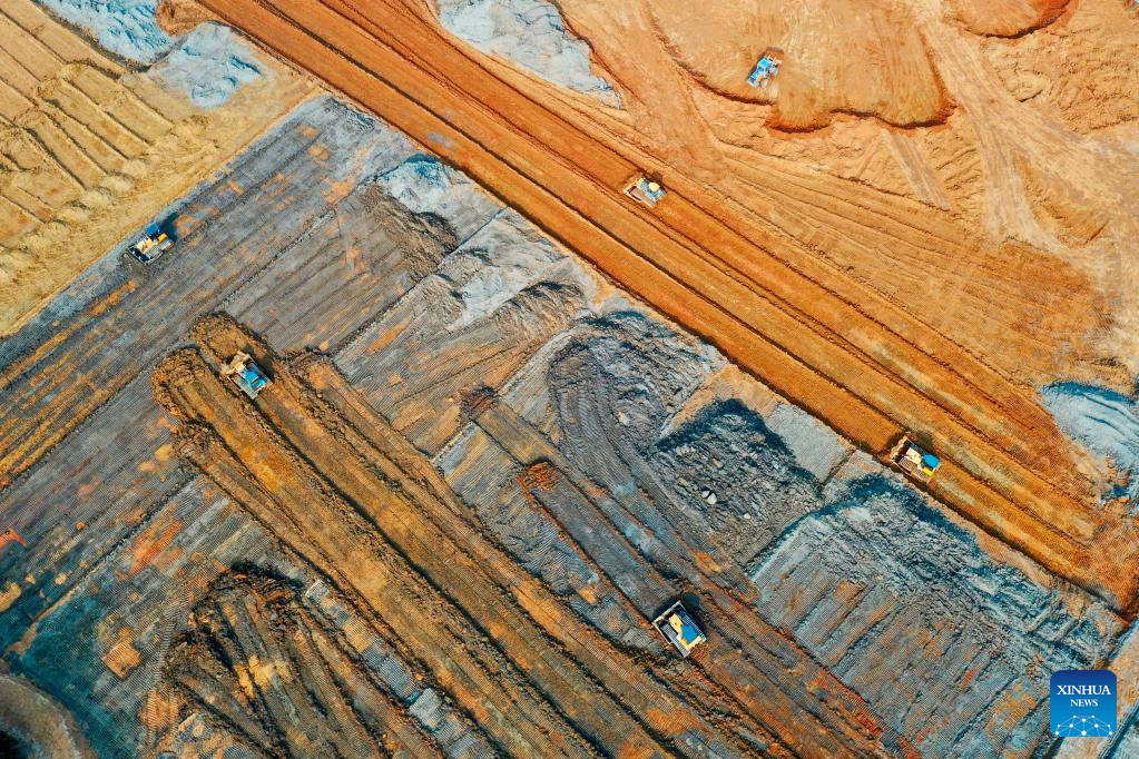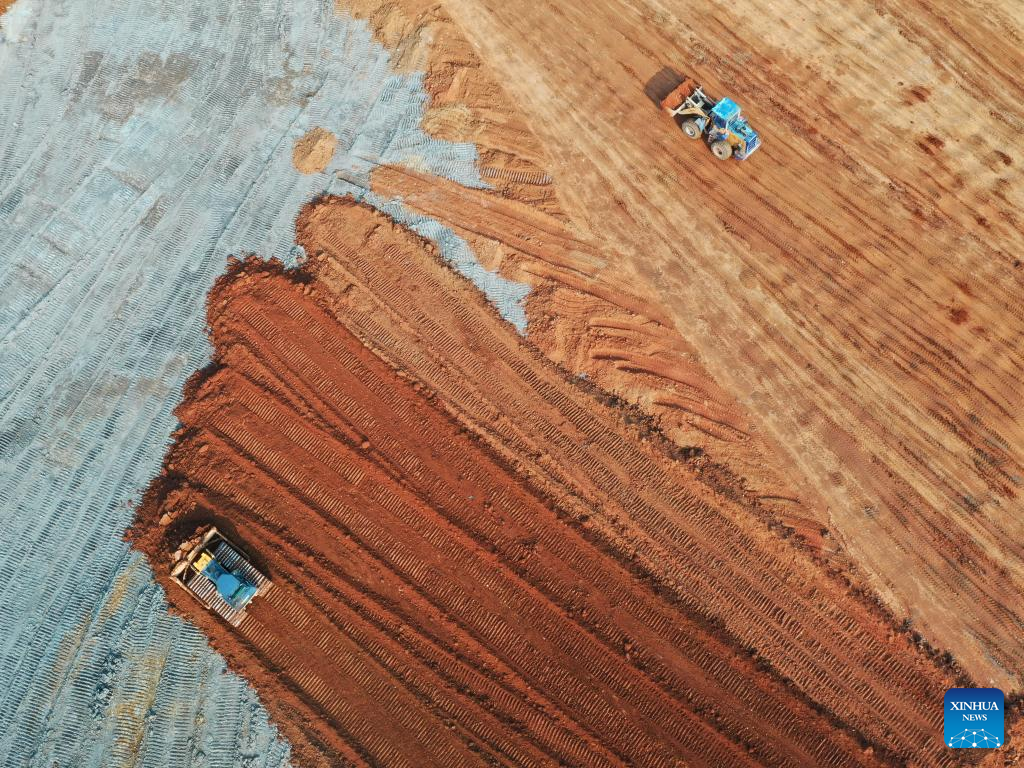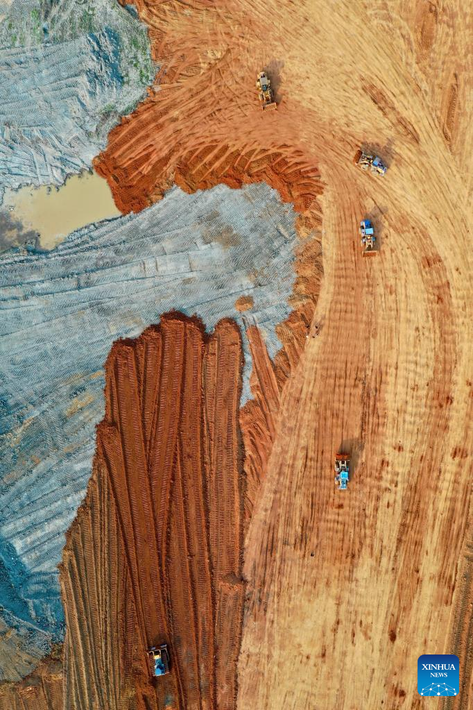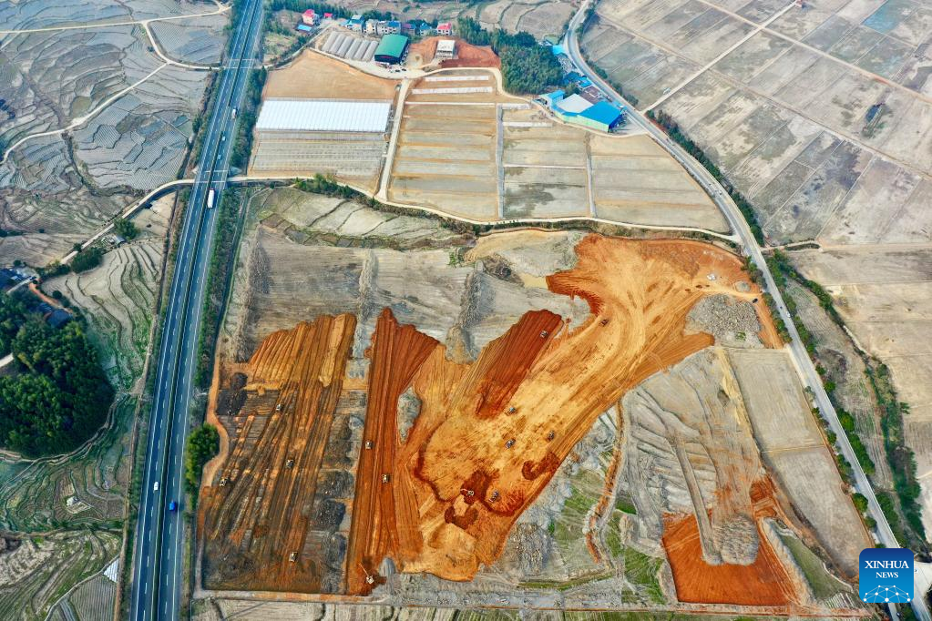 This aerial photo taken on March 2, 2023 shows bulldozers and excavators working to build high-standard farmlands in Pucheng County, southeast China's Fujian Province. A new round of high-standard farmlands building is underway in Pucheng County in preparation of spring ploughing. (Xinhua/Jiang Kehong)