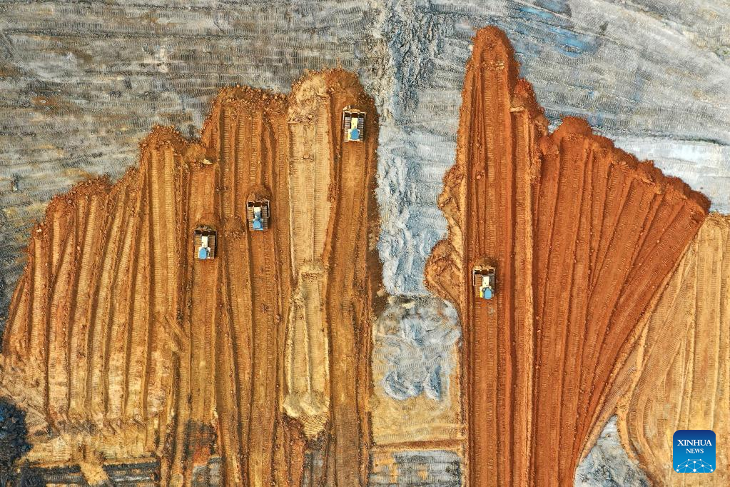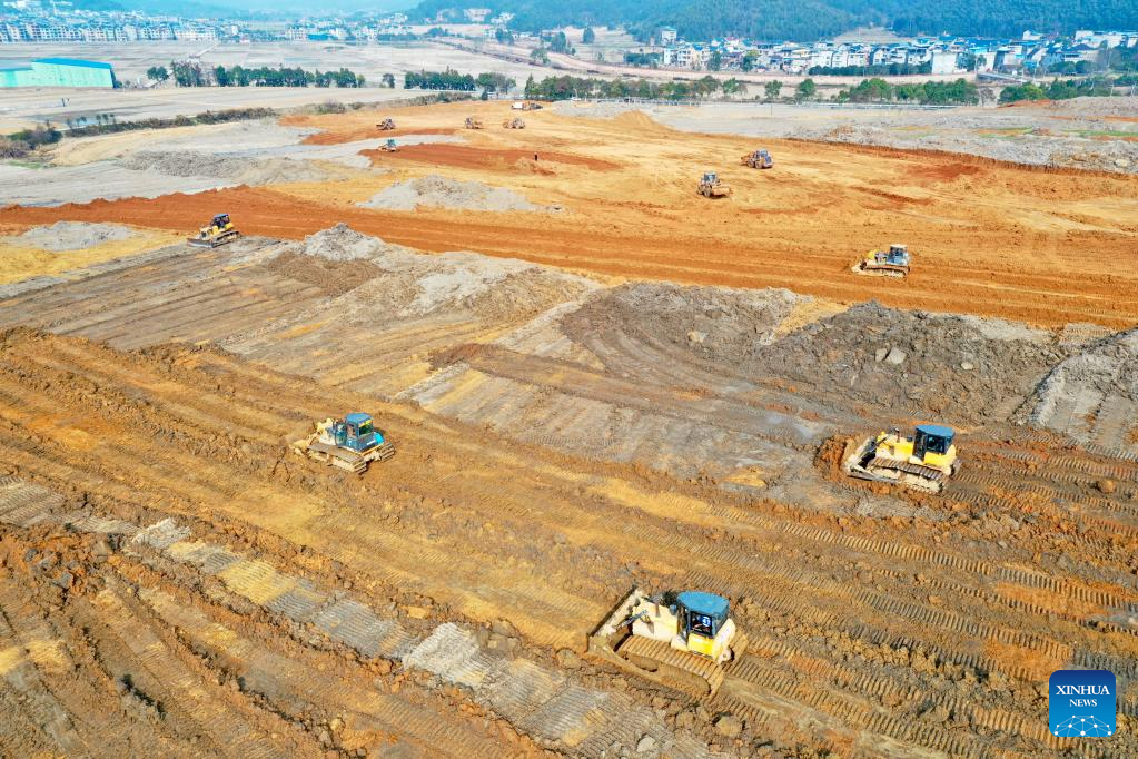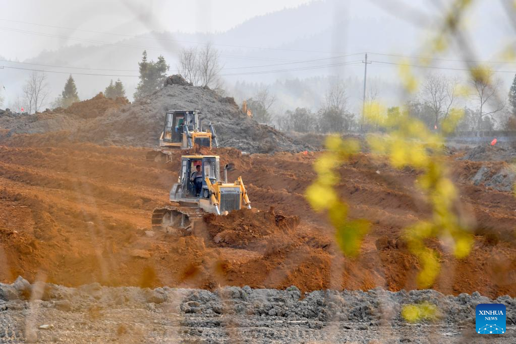 This aerial photo taken on March 2, 2023 shows bulldozers working to build high-standard farmlands in Pucheng County, southeast China's Fujian Province. A new round of high-standard farmlands building is underway in Pucheng County in preparation of spring ploughing. (Xinhua/Jiang Kehong)