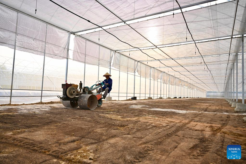 A worker levels the land to build high-standard farmland at a greenhouse paddy field in Pucheng County, southeast China's Fujian Province, March 2, 2023. A new round of high-standard farmlands building is underway in Pucheng County in preparation of spring ploughing. (Xinhua/Jiang Kehong)