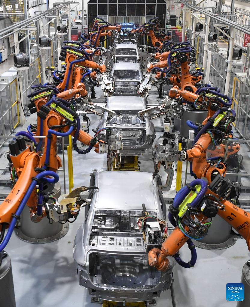 Robots conduct welding work at the workshop of GAC Aion, an NEV subsidiary of Guangzhou Automobile Group Co., Ltd. (GAC Group), in Guangzhou, south China's Guangdong Province, Feb. 24, 2023. Guangzhou, one of China's major car manufacturing bases, has been striving to attract investment in NEV industry in recent years. (Xinhua/Deng Hua)