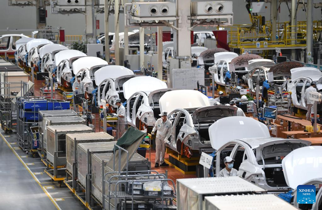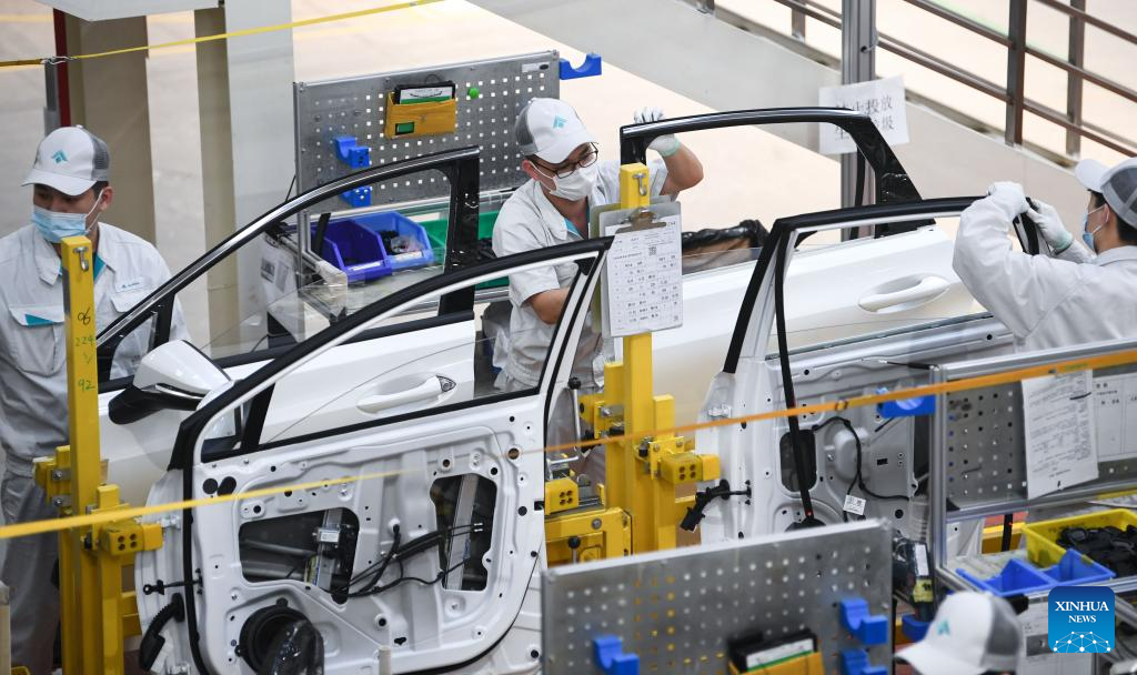 This photo taken on Feb. 24, 2023 shows the assembly line of GAC Aion, an NEV subsidiary of Guangzhou Automobile Group Co., Ltd. (GAC Group), in Guangzhou, south China's Guangdong Province. Guangzhou, one of China's major car manufacturing bases, has been striving to attract investment in NEV industry in recent years. (Xinhua/Deng Hua)