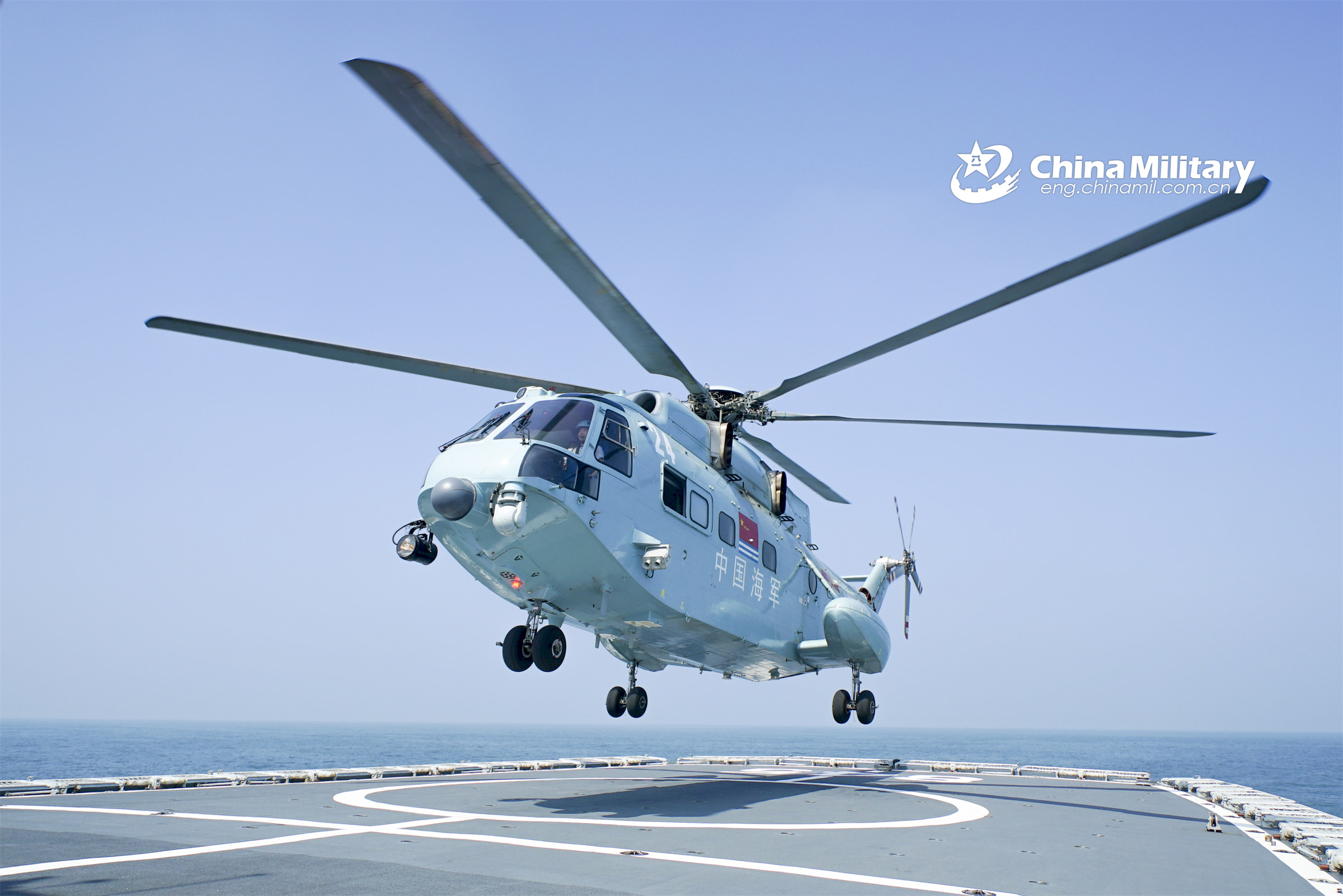 A ship-borne helicopter assigned to the PLA Naval Aviation University lands on the helipad of a vessel assigned to a naval flotilla under the PLA North Theater Command during a combat rescue exercise on February 10, 2023. (eng.chinamil.com.cn/Photo by Hu Jiajie)