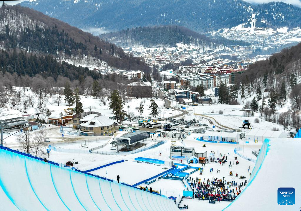 Photo taken on March 3, 2023 shows the competition zone of the women's halfpipe final at the FIS Snowboard World Championships in Bakuriani, Georgia. (Photo by Tamuna Kulumbegashvili/Xinhua)