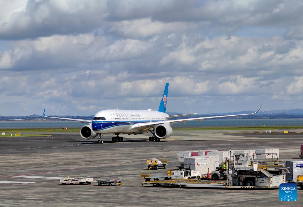 The China Southern Airlines CZ305 flight carrying a group of Chinese tourists arrives at the Auckland Airport in Auckland, New Zealand, March 3, 2023. (Photo by Cheng Qilin/Xinhua)