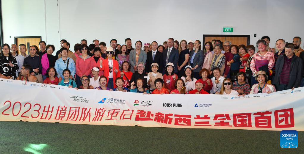 Chinese tourists take part in a welcome ceremony at the Auckland Airport in Auckland, New Zealand, March 3, 2023. (Xinhua/Guo Lei)
