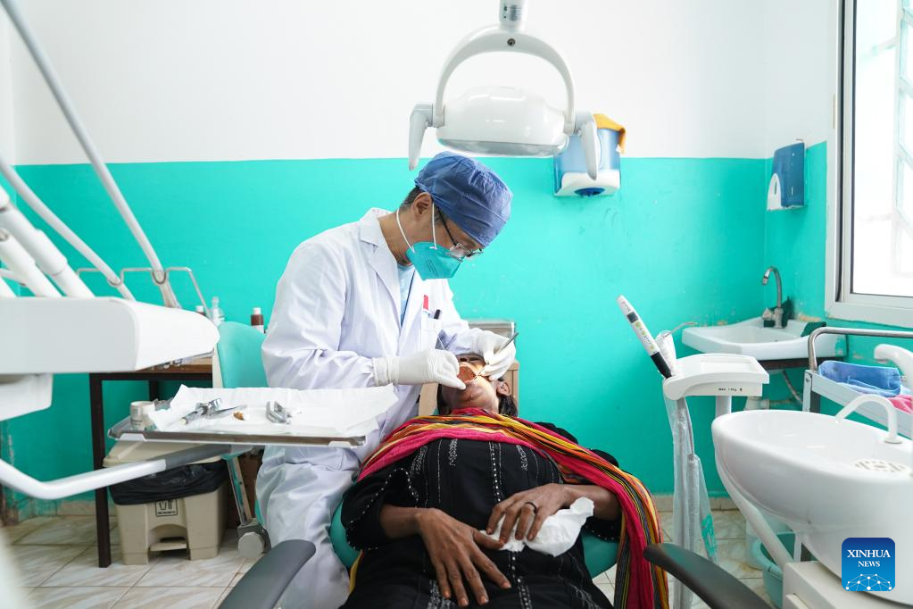 Hou Wei, a member of the 21st Chinese medical team dispatched to Djibouti, provides medical treatments for a patient at the Peltier General Hospital in Djibouti City, Djibouti, March 1, 2023. The 21st Chinese medical team dispatched to Djibouti has been providing medical services at the Peltier General Hospital since January 2022. By the end of February 2023, the medical team had provided 14,658 outpatient services, 576 emergency services and completed 1,168 surgeries. (Xinhua/Han Xu)