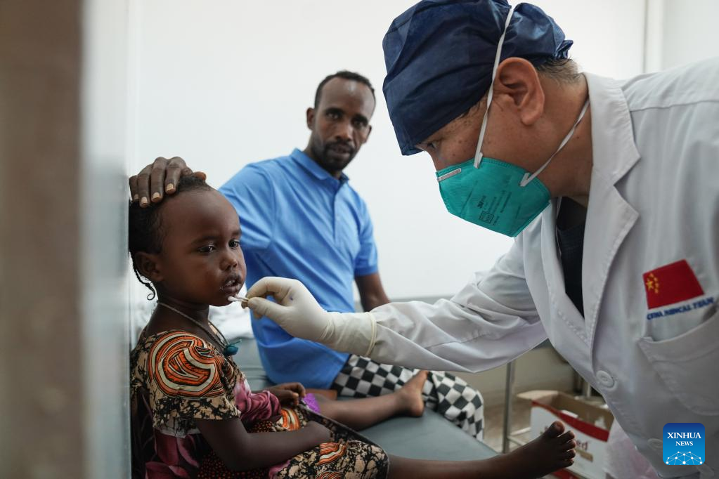 Zhou Naizhong, a member of the 21st Chinese medical team dispatched to Djibouti, provides medical treatments for a child at the Peltier General Hospital in Djibouti City, Djibouti, Feb. 28, 2023. The 21st Chinese medical team dispatched to Djibouti has been providing medical services at the Peltier General Hospital since January 2022. By the end of February 2023, the medical team had provided 14,658 outpatient services, 576 emergency services and completed 1,168 surgeries. (Xinhua/Han Xu)