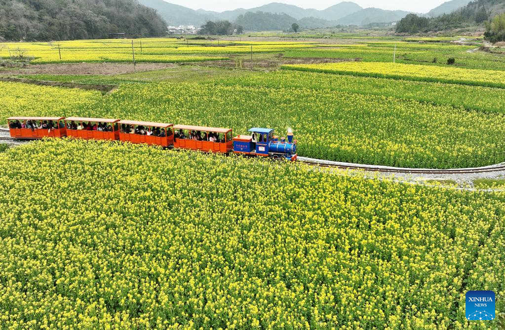 People take a sightseeing train at a scenic spot in Wuyuan County of east China's Jiangxi Province, March 3, 2023. Spring scenery in Wuyuan attracts lots of visitors with the rising of temperature. (Xinhua/Wan Xiang)