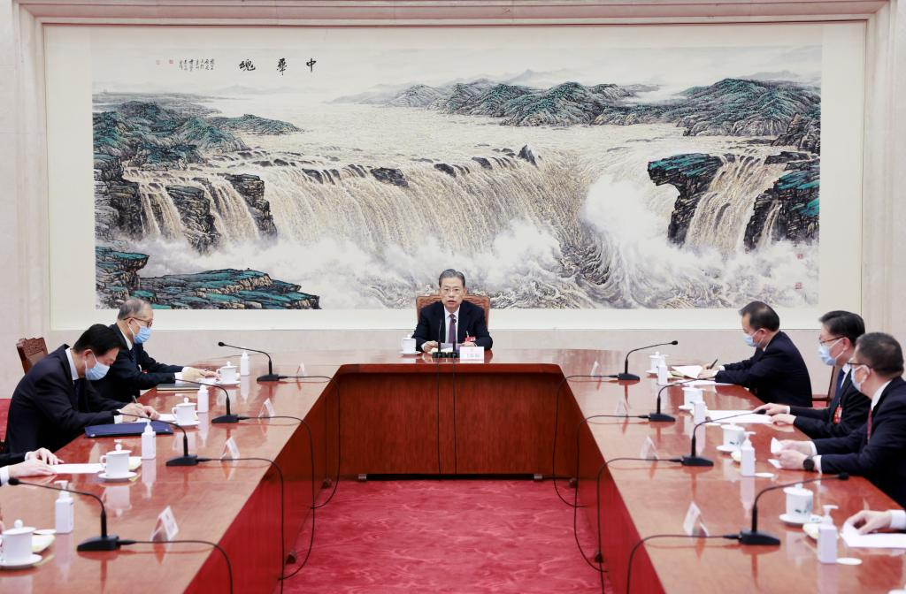 Zhao Leji, an executive chairman of the presidium of the first session of the 14th National People's Congress (NPC), chairs the first meeting of executive chairpersons of the presidium at the Great Hall of the People in Beijing, capital of China, March 4, 2023. (Xinhua/Ding Lin)