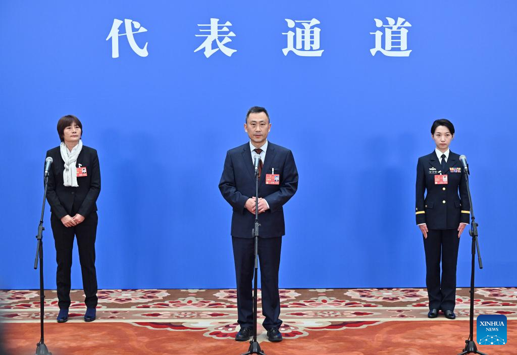 Deputies to the 14th National People's Congress (NPC) are interviewed ahead of the opening meeting of the first session of the 14th NPC in Beijing, capital of China, March 5, 2023. (Xinhua/Liu Jinhai)