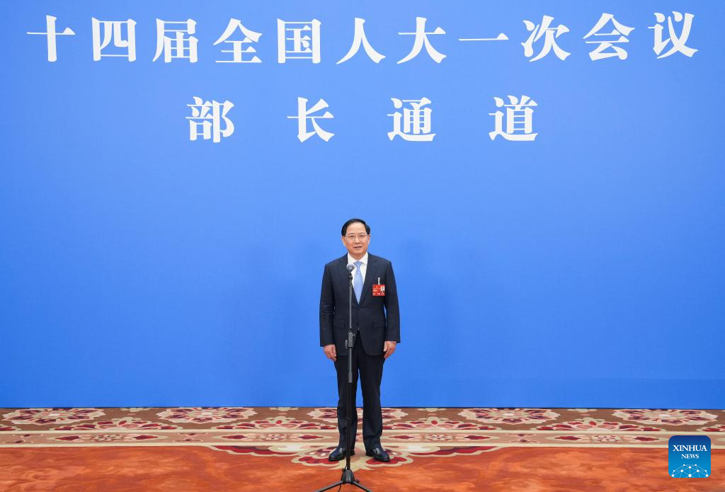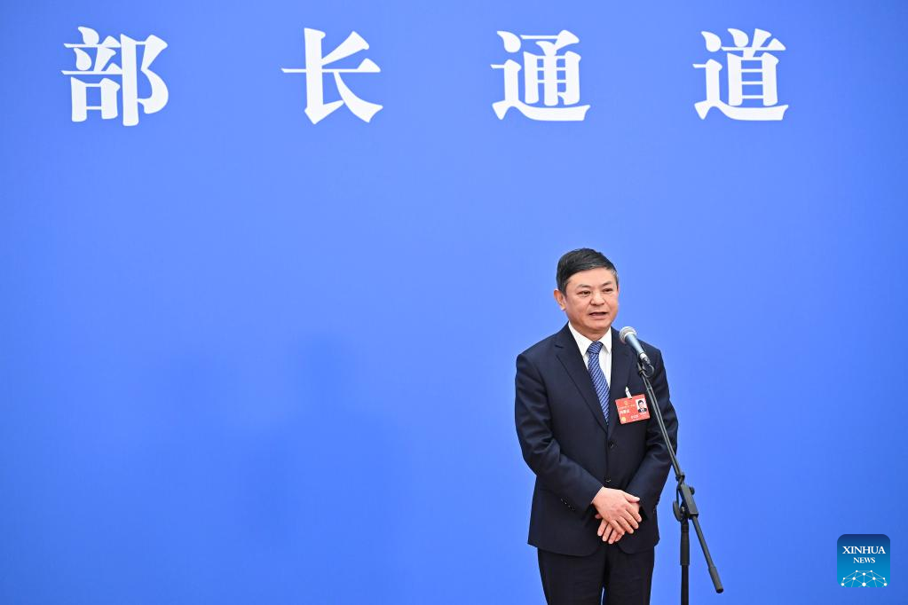 Minister of Industry and Information Technology Jin Zhuanglong gives an interview after the opening meeting of the first session of the 14th National People's Congress (NPC) in Beijing, capital of China, March 5, 2023. (Xinhua/Liu Jinhai)