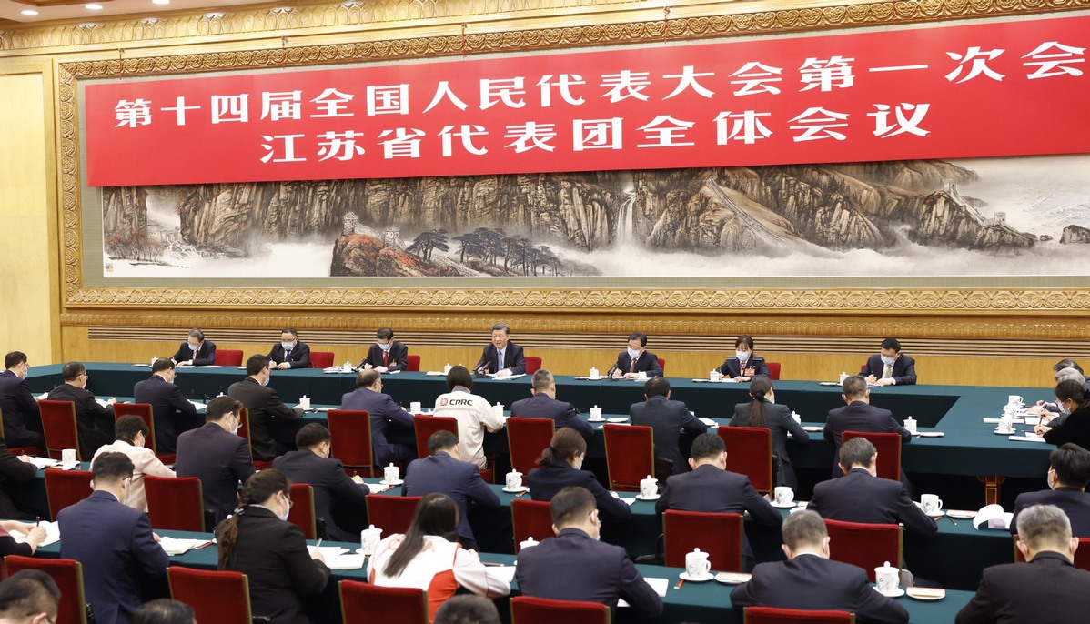 President Xi Jinping, who is also general secretary of the Communist Party of China Central Committee and chairman of the Central Military Commission, takes part in a deliberation with deputies from the delegation of Jiangsu province at the first session of the 14th National People's Congress in Beijing on Sunday. [Photo/Xinhua]