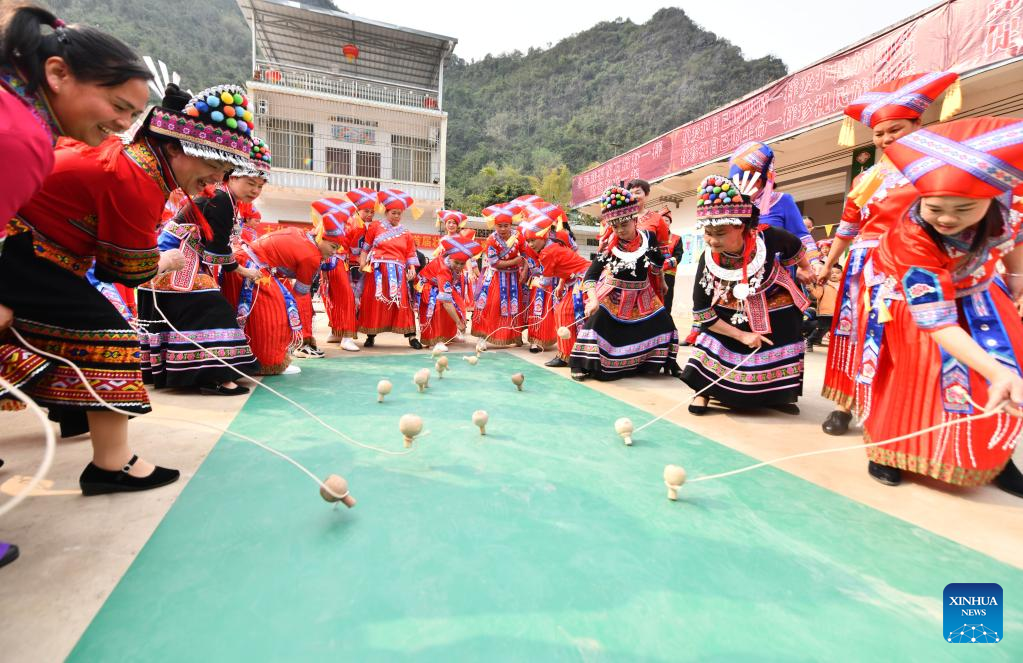 Women take part in a spinning top competition to celebrate the upcoming International Women's Day in Renliang Village of Dahua Yao Autonomous County, south China's Guangxi Zhuang Autonomous Region, March 5, 2023. (Xinhua/Huang Xiaobang)