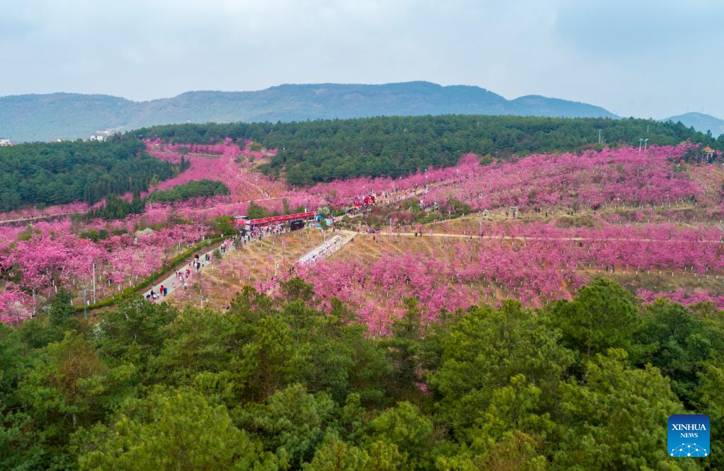 Tourists visit a scenic area which features over 400 mu (about 26.7 hectares) of cherry blossoms in Malong District of Qujing City, southwest China's Yunnan Province, March 5, 2023. (Xinhua/Chen Xinbo)